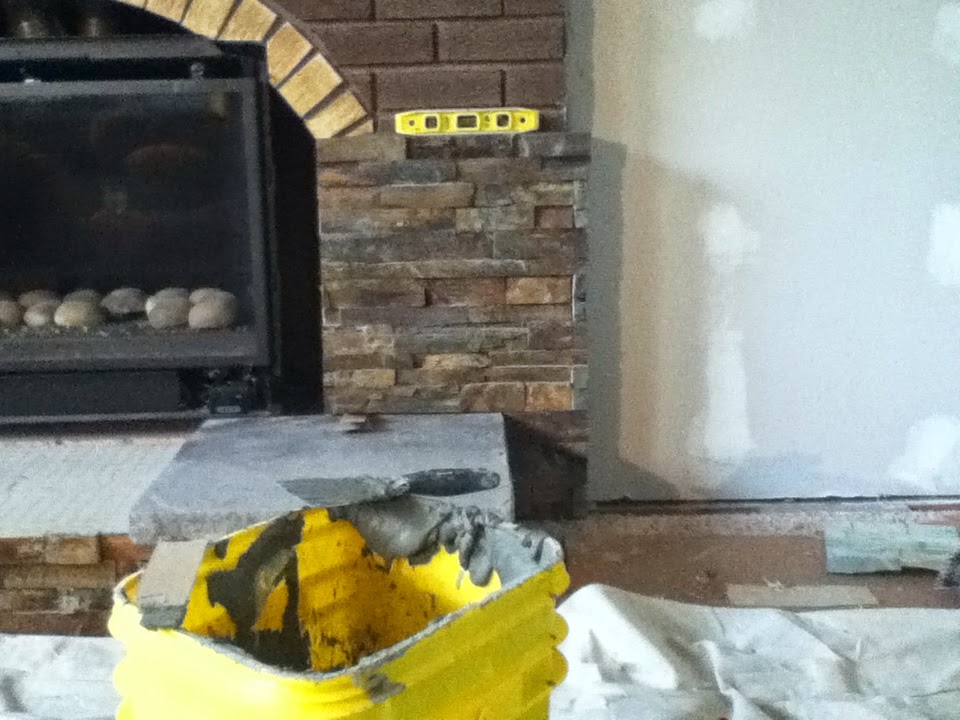 Over the summer I've been slowly working on our fireplace. This winter past we bought a gas insert that we really enjoy, but have wanted to replace the eyesore of full-wall-length red and blonde brick that surrounded our fireplace.